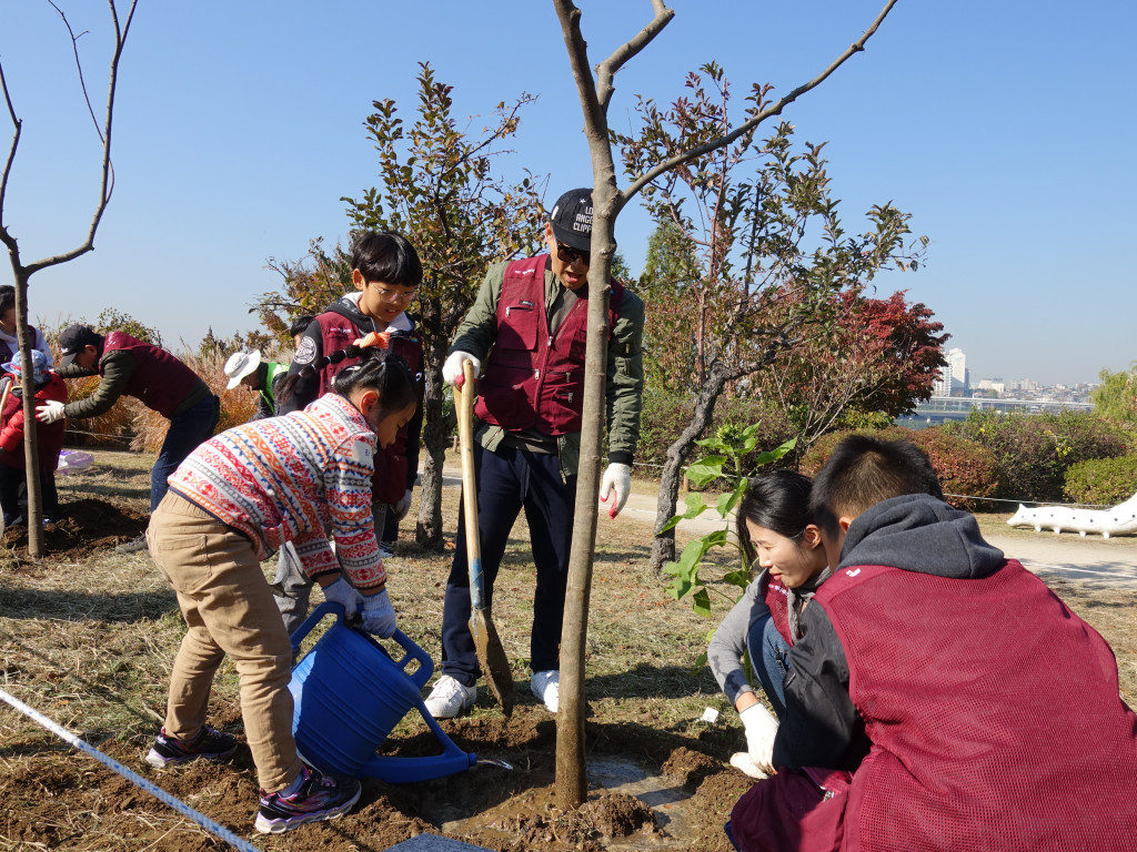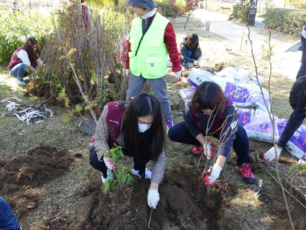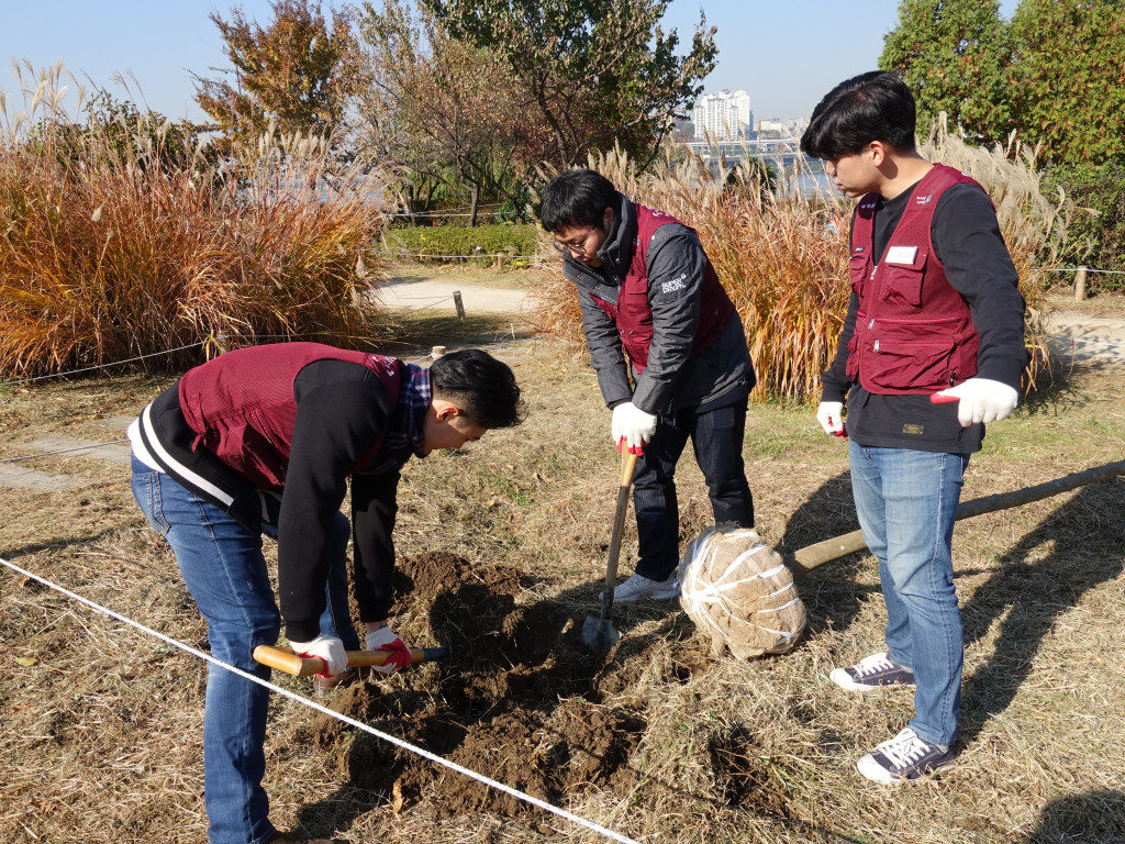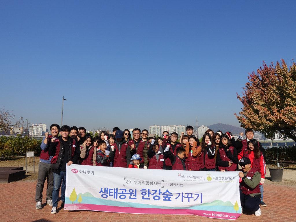 때 이른 추위가 한 풀 가신 11월 첫주 토요일! 이 날은 하나투어와 올해 마지막 활동을 하는 날입니다. 마지막 활동은 조금 특별하게 진행이 되었어요! 바로, 그 동안 식재하던 구역이 아닌, 그 맞은편에 나무를 심었답니다. 이렇게 점점 활동구역을 넓혀가게 되는 걸까요? ㅎㅎ 오랜 활약덕분에 이렇게 활동할 수 있는 범위가 점점 넓어져갈 수 있는 것 같아 저희 마음도 뿌듯해집니다.