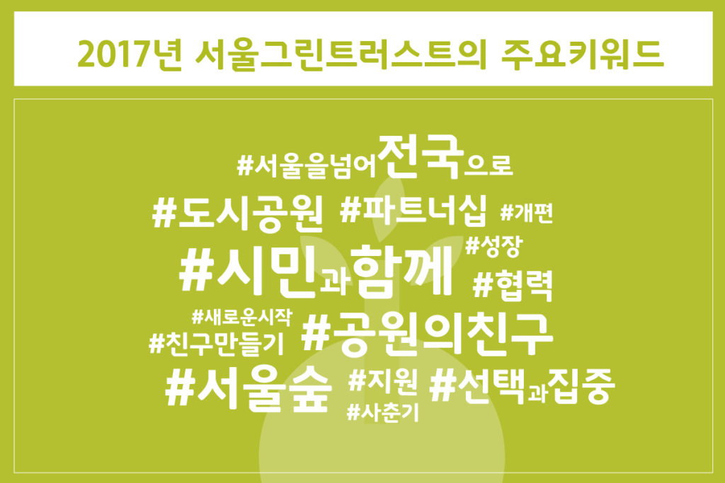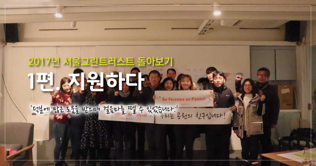 '지원','연결','모델' 이라는 2017년도 운영방향에 맞추어 총 3편으로 여러분과 함께 서울그린트러스트의 2017년을 돌아보고자 합니다. 큰 결과는 아니더라도, 작은 이야기들 속에 담겨진 소소한 기쁨이 여러분께도 전해지길 바래봅니다. 초록은 희망입니다. :-)