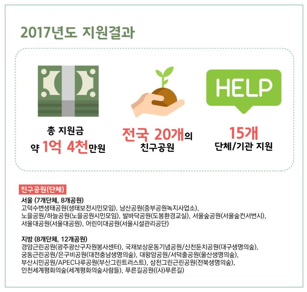 덕분에 필요성은 느꼈지만 예산과 경험부족으로 공원봉사활동을 선뜻 시작하기 어려웠던 지역단체들이 지역 주민들과 공원을 지키고 가꾸는 일을 시작할 수 있었구요!(감동)