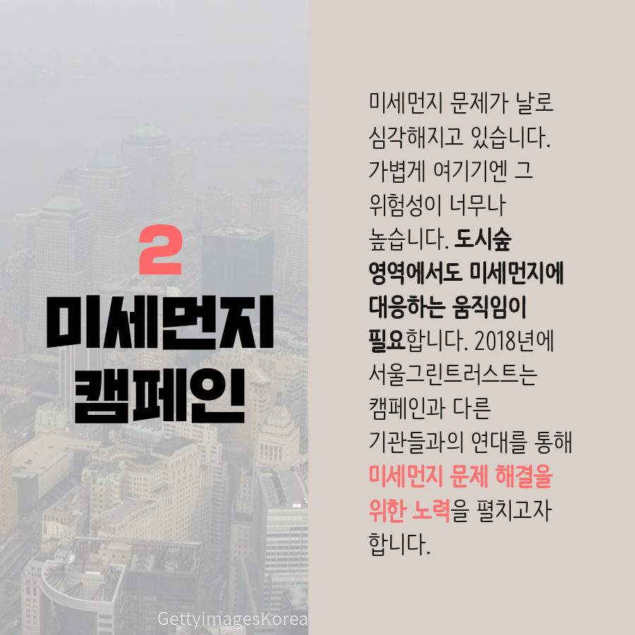 미세먼지 문제가 날로 심각해지고 있습니다. 가볍게 여기기엔 그 위험성이 너무나 높습니다. 도시숲 영역에서도 미세먼지에 대응하는 움직임이 필요합니다. 2018년에 서울그린트러스트는 캠페인과 다른 기관들과의 연대를 통해 미세먼지 문제 해결을 위한 노력을 펼치고자 합니다.