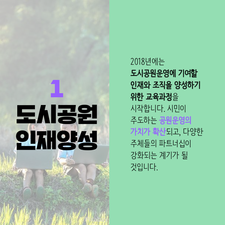 2018년에는 도시공원운영에 기여할 인재와 조직을 양성하기 위한 교육과정을 시작합니다. 시민이 주도하는 공원운영의 가치가 확산되고, 다양한 주체들의 파트너십이 강화되는 계기가 될 것입니다.